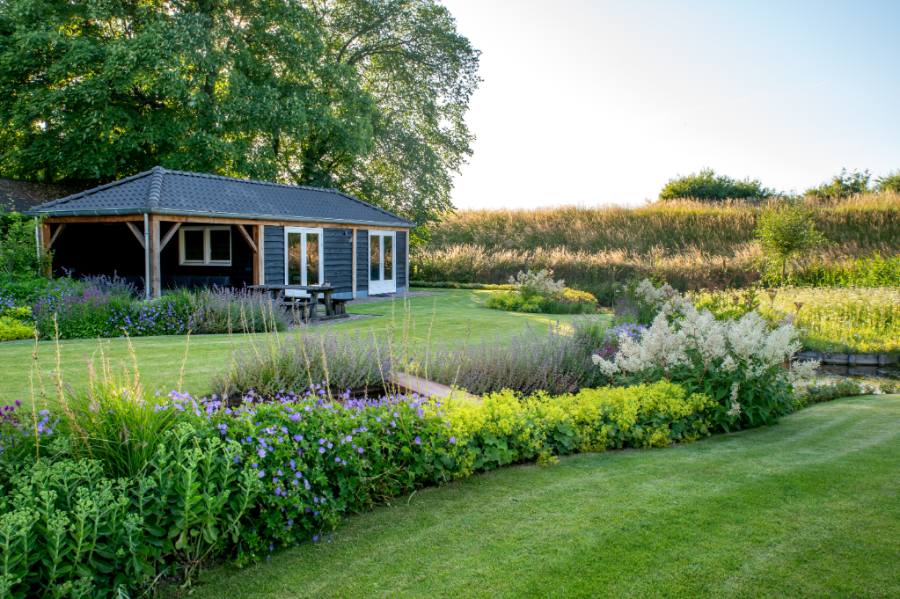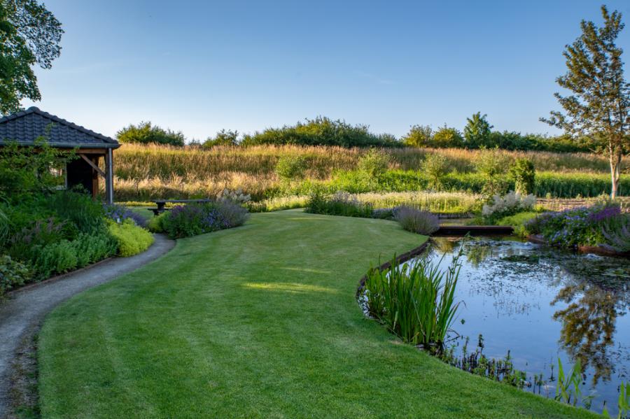 Vanaf het terras aan de woning heb je mooi zicht over de tuin en het achterliggende landschap. Via een mooie, statige trap leiden de organisch vormgegeven paden je door de tuin naar de vijver.