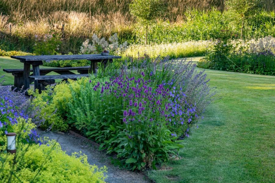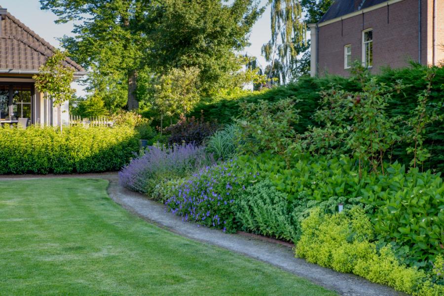 Aan weerszijden van de statige trap zie je groene wolken van Portugese laurier. De overige (vaste) planten zijn geplaatst in groepen. Alle beplanting binnen deze tuin past goed bij de kleigrond waarop deze tuin is aangelegd.