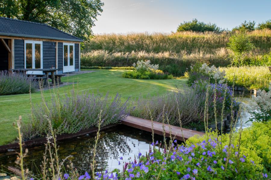 Deze vijver bestaat voor een deel uit natuurwater van de sloot die achter de tuin ligt. De randen van de vijver en de brug zijn gemaakt van cortenstaal.