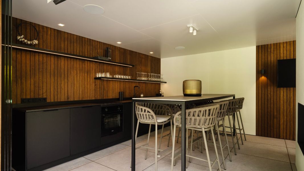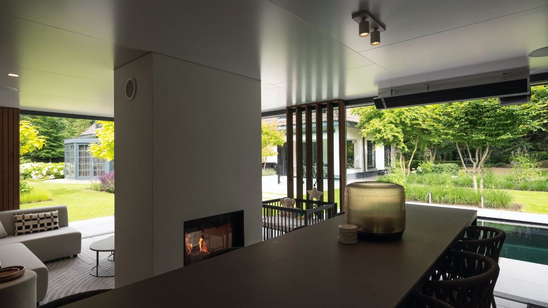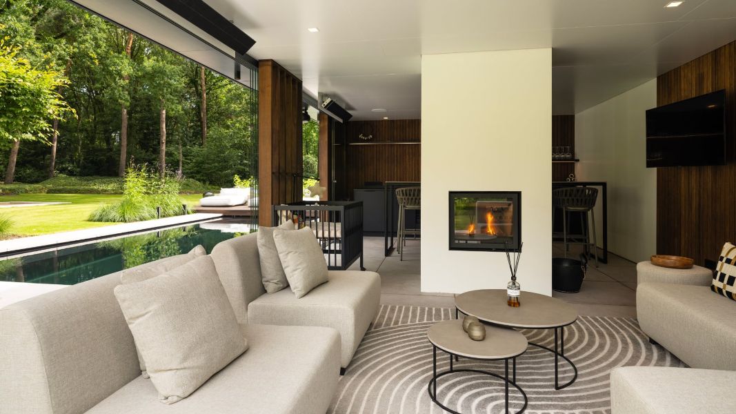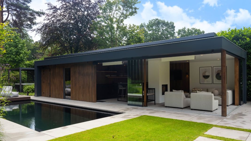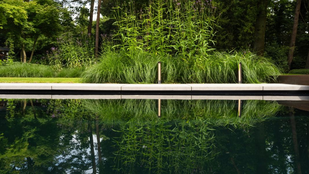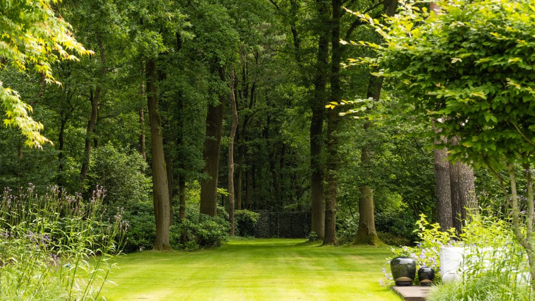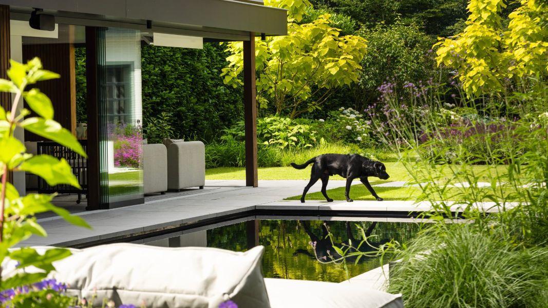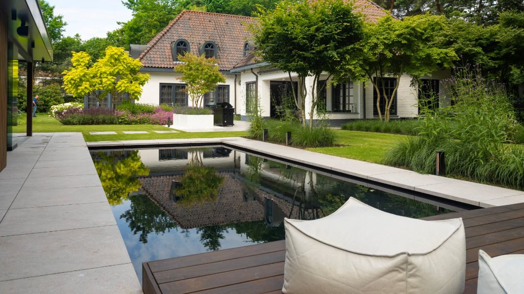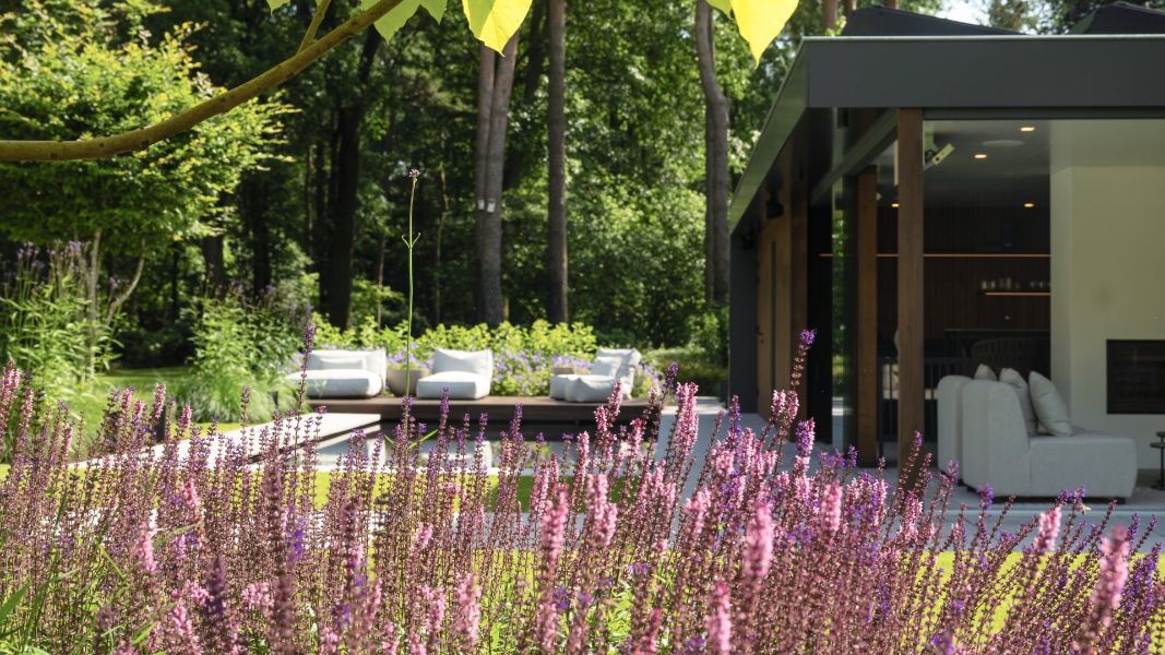 In deze moderne bostuin gaan luxe en natuur naadloos samen. Een strak zwembad en poolhouse met sauna en bar bieden comfort in elk seizoen.