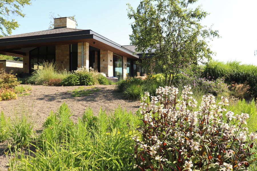 De bewuste keuze voor lavagranulaat in plaats van traditioneel gazon zorgt niet alleen voor minimaal onderhoud, maar creëert ook een unieke textuur die het hele jaar door interessant blijft. De weelderige prairiebeplanting trekt vlinders en bijen aan.