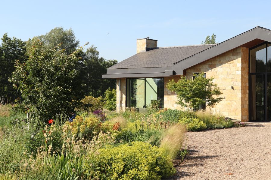 Met een combinatie van prairietuin en lavagranulaat creëerden we een onderhoudsvriendelijke tuin die naadloos aansluit bij de omringende natuur.